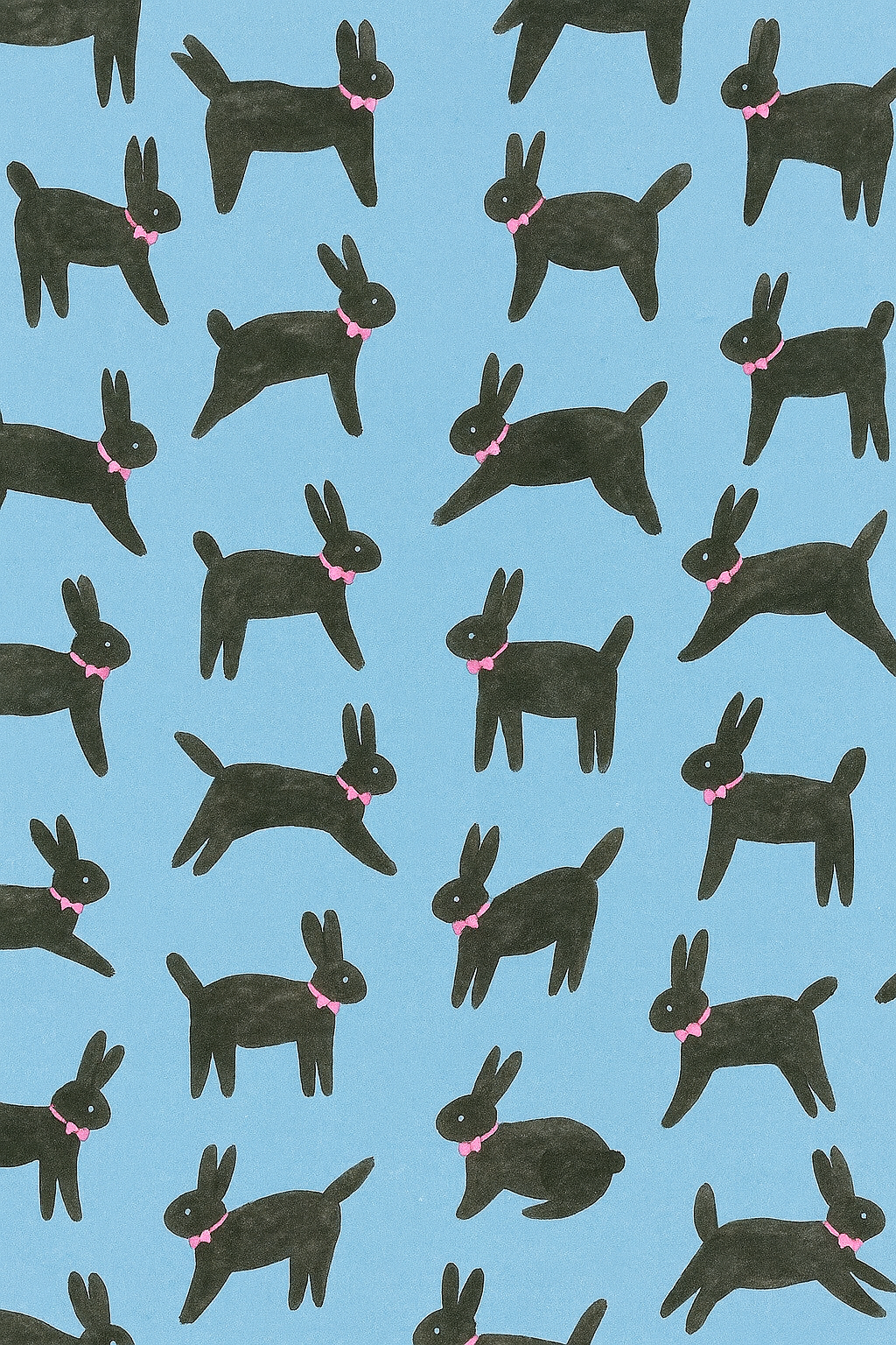 水色の背景に、ピンクのリボンをしたうさぎがつどってるデザイン。