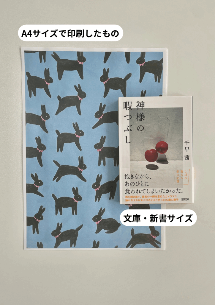 A4サイズの用紙に印刷すれば、「文庫サイズ」と「新書サイズ」のブックカバーが作れます。